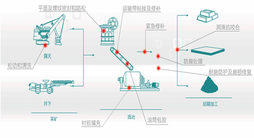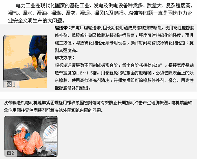 圖2: 礦用橡膠輸送帶斷裂或更換新的輸送帶,傳統(tǒng)工藝用,鋼絲扣或熱硫化連接。用橡膠粘接劑,可以實現(xiàn)高強度的韌性連接;用橡膠修補劑進行封口,減少物料對接口的磨損,省工、省時,可靠性高。