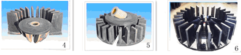 圖4、5、6為浮選機轉子、定子,使用橡膠修復劑(NPT129、NPT130、NPT131),設備專用修復劑(NPTJ30、NPTJ16),使用壽命達到原件使用壽命2倍;