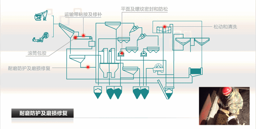 洗煤生產(chǎn)工藝復雜,設備磨損快,維修量大,如旋流器、離心機、溜槽等,NPT系列設備專用修復劑解決磨損問題,操作簡單,耐磨更長久