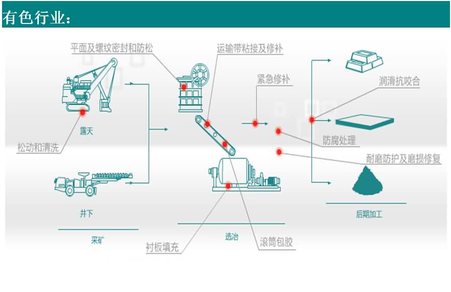 圖2: 礦用橡膠輸送帶斷裂或更換新的輸送帶,傳統(tǒng)工藝用,鋼絲扣或熱硫化連接。用橡膠粘接劑,可以實(shí)現(xiàn)高強(qiáng)度的韌性連接;用橡膠修補(bǔ)劑進(jìn)行封口,減少物料對接口的磨損,省工、省時(shí),可靠性高圖3: 大型破碎機(jī)大牙松脫,嚴(yán)重影響采掘進(jìn)度。用螺紋鎖固密封劑配合螺栓裝配,大大提高了大牙裝配的可靠性。