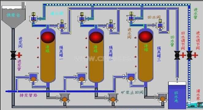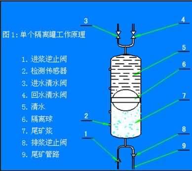 水隔離漿體泵是由高位礦漿池(濃縮池或喂料泵)向隔離罐中浮球下部喂礦漿,再用清水泵向浮球上部供高壓清水,再通過浮球?qū)毫鬟f給礦漿,并把礦漿推到外管線輸送到指定地點(diǎn)。由微機(jī)控制的液壓站驅(qū)動(dòng)六臺(tái)清水閥,使三個(gè)隔離罐交替排漿、喂?jié){,實(shí)現(xiàn)均勻穩(wěn)定輸送。通過傳感器反饋的信號(hào),微機(jī)對(duì)系統(tǒng)進(jìn)行實(shí)時(shí)監(jiān)控,并由故障診斷專家系統(tǒng)對(duì)故障進(jìn)行分析、判斷,再通過可視化系統(tǒng)提示給操作者。該產(chǎn)品的總體思路與原理具有創(chuàng)新性。它利用高效率、長(zhǎng)壽命的離心式清水泵作動(dòng)力源采用巧妙的隔離裝置——浮球,把工作介質(zhì)(清水)與被傳輸介質(zhì)(礦漿)隔離開。隔離裝置即將清水動(dòng)力傳遞給漿體,還將離心泵的旋轉(zhuǎn)運(yùn)動(dòng)方式轉(zhuǎn)變成了容積泵的往復(fù)運(yùn)動(dòng)方式。使本產(chǎn)品兼具離心泵流量大,往復(fù)泵揚(yáng)程高的雙重特點(diǎn)。