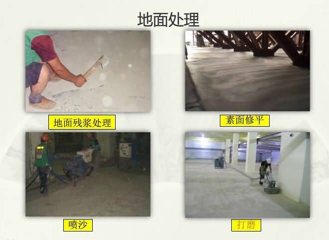 1.素地處理:①基礎素地以水泥粉光面或磨石地為準;②素地需養(yǎng)生28天以上,水份需8%以下方可施工素地如有不平或空鼓需加以除去;③用環(huán)氧砂漿補平地面;④素地之油污需澈底清洗干凈;⑤施工前需保持施工素地之干燥和清潔;