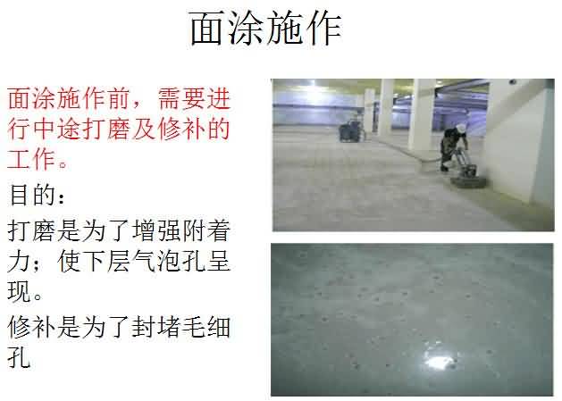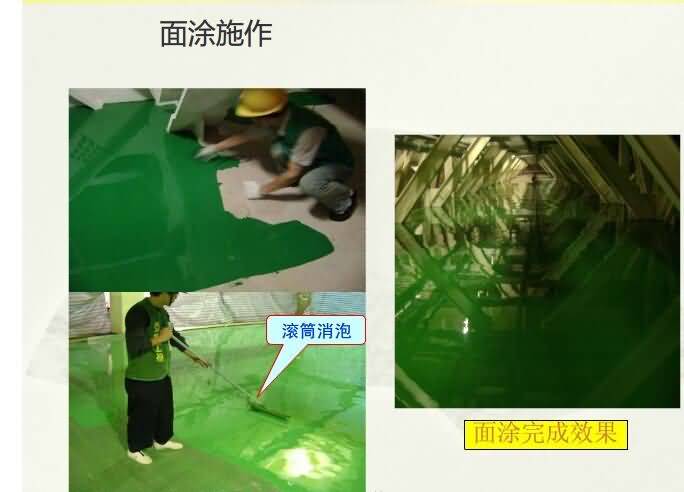 5.面涂層:①施工前需保持干凈如有雜物粘附需清除;②使用前主劑先攪拌均勻;③依照正確比例將主劑及硬化劑混合,充分攪拌;④使用滾筒或鏝刀將材料均勻涂布混合完成材料需30分鐘以內(nèi)施工完成;⑤施工交接處需做好交接處理;⑥施工完成后,24小時后方可上人,7天后方可重壓(以250C為準,低溫時開放時間需適度延長)。