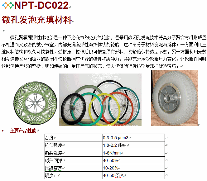 微孔聚氨酯彈性體輪胎是一種不必充氣的免充氣輪胎,是采用微閉孔發(fā)泡技術將高分子聚合材料形成互不相通而又致密的微小氣室,內(nèi)部充滿高彈性海綿體狀的輪胎。這種高分子材料發(fā)泡海綿體:一方面利用三維網(wǎng)狀結構和永久可恢復性,受擠壓、拉伸后仍可恢復原有形狀,使輪胎保持造型不變,另一方面利用無數(shù)相互連接又互相獨立的微閉孔使輪胎擁有優(yōu)異的彈性和緩沖力,并能充分承受輪胎壓力變化,讓輪胎任何時候都保持足夠的堅挺,猶如傳統(tǒng)的內(nèi)胎打足氣的狀態(tài),使人仍像騎行傳統(tǒng)輪胎那樣舒適輕巧。