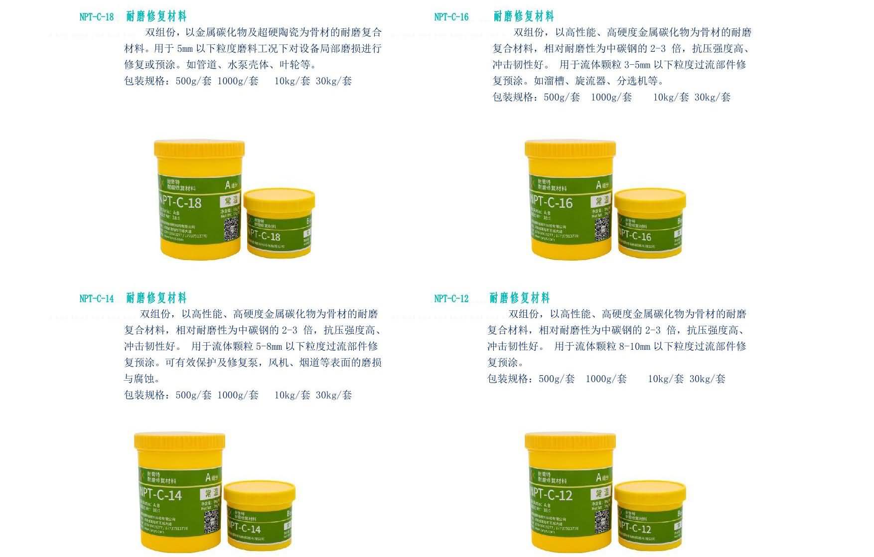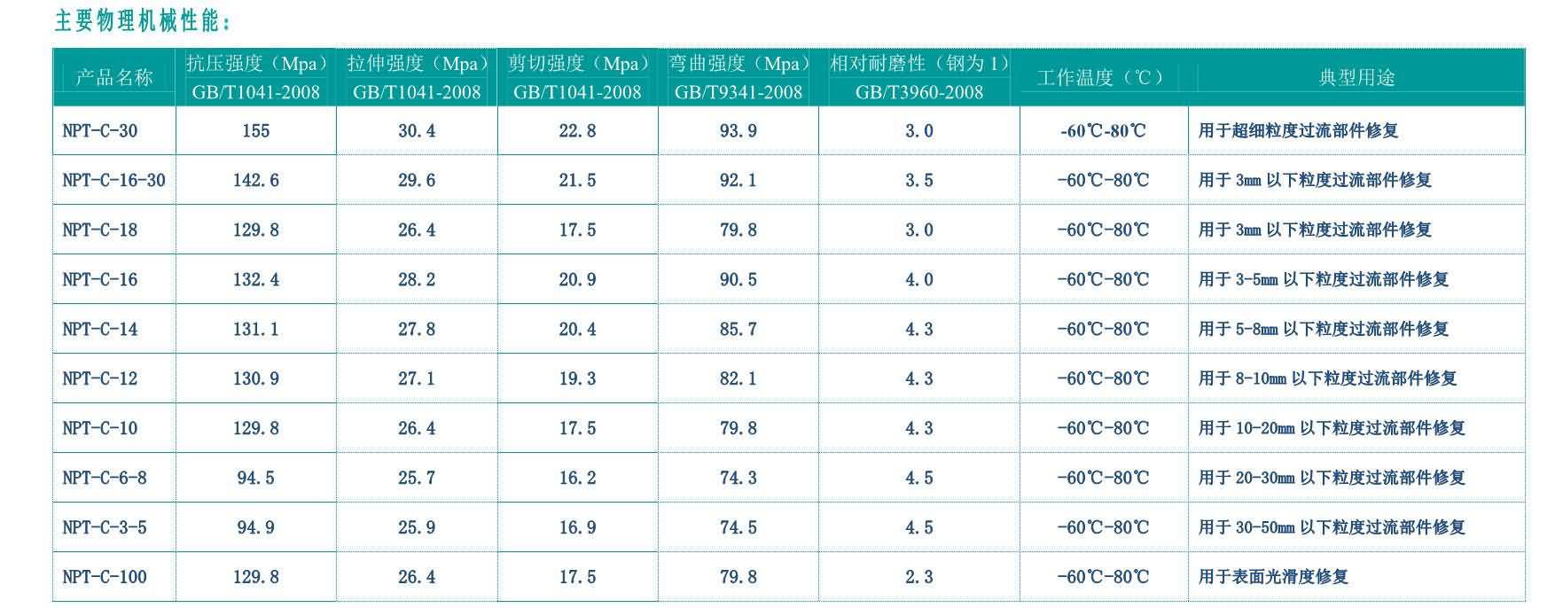 雙組分,以陶瓷、金屬碳化物、微型顆粒為骨材的耐磨復合材料,具有耐水、耐油、耐酸堿性。適用于(工作溫度在-60℃~80℃)設(shè)備過流沖蝕、設(shè)備的大面積修復、設(shè)備預涂耐磨層,如旋流器、浮選柱、浮選機、泡沫槽、分級機、攪拌桶、溜槽、管件類、泵類等修復(典型用途見主要物理機械性能表)。