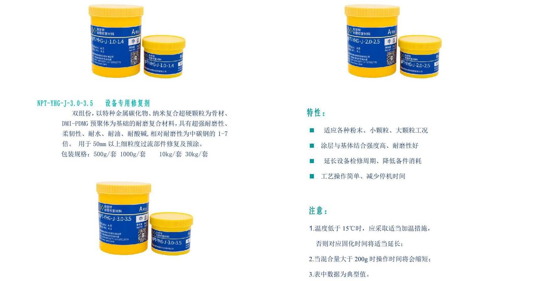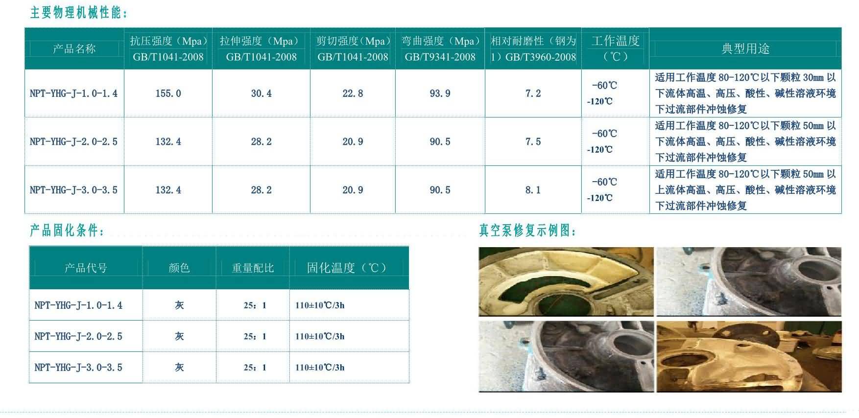 雙組分,以金屬碳化物、納米復(fù)合超硬顆粒為骨材、DNI-PDMG預(yù)聚體為基礎(chǔ)的耐磨復(fù)合材料,具有超強(qiáng)耐磨性、柔韌性、耐水、耐油、耐酸堿性。適用(-60℃-120℃)惡略環(huán)境中設(shè)備過流沖蝕(顆粒大于50mm)、設(shè)備的局部修復(fù)、設(shè)備預(yù)涂耐磨層,如旋流器、浮選柱、浮選機(jī)、泡沫槽、分級機(jī)、攪拌桶、溜槽、管件類、渣漿泵、脫硫泵、污水泵、往復(fù)泵、隔膜泵等泵類修復(fù)(典型用途見主要物理機(jī)械性能表)。