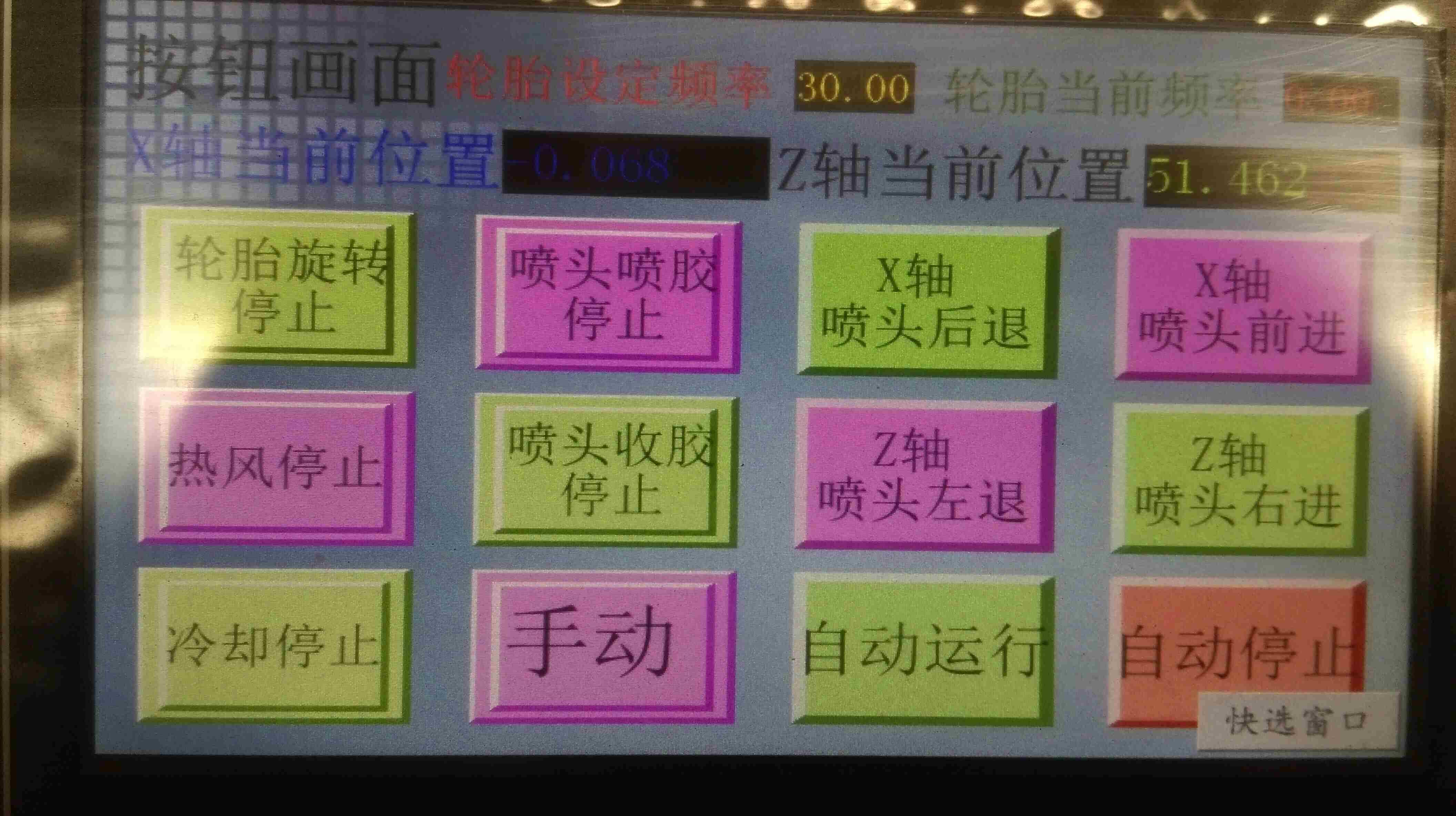 5、發(fā)現(xiàn)以下問題之一時,要立即退出自動狀態(tài):①噴頭出膠不均勻或堵塞;②輪胎震動過大造成噴涂不能順利進行等。依次點擊“自動停止”、“手動”、按鈕,退出自動運行狀態(tài),點擊“輪胎旋轉(zhuǎn)停止”按鈕保持輪胎繼續(xù)轉(zhuǎn)動防止前期噴涂膠液流動。待故障排除后重新執(zhí)行噴涂操作,噴涂時間要減去故障前已用時間。