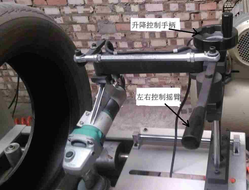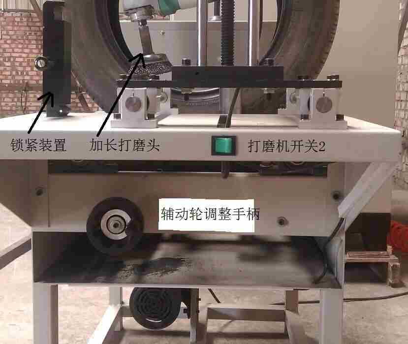 3、旋轉(zhuǎn)輔動輪調(diào)整手柄,調(diào)整輔動輪輕輕接觸輪胎外壁,壓力不能過大,根據(jù)輪胎的大小調(diào)整合適的打磨頭長度